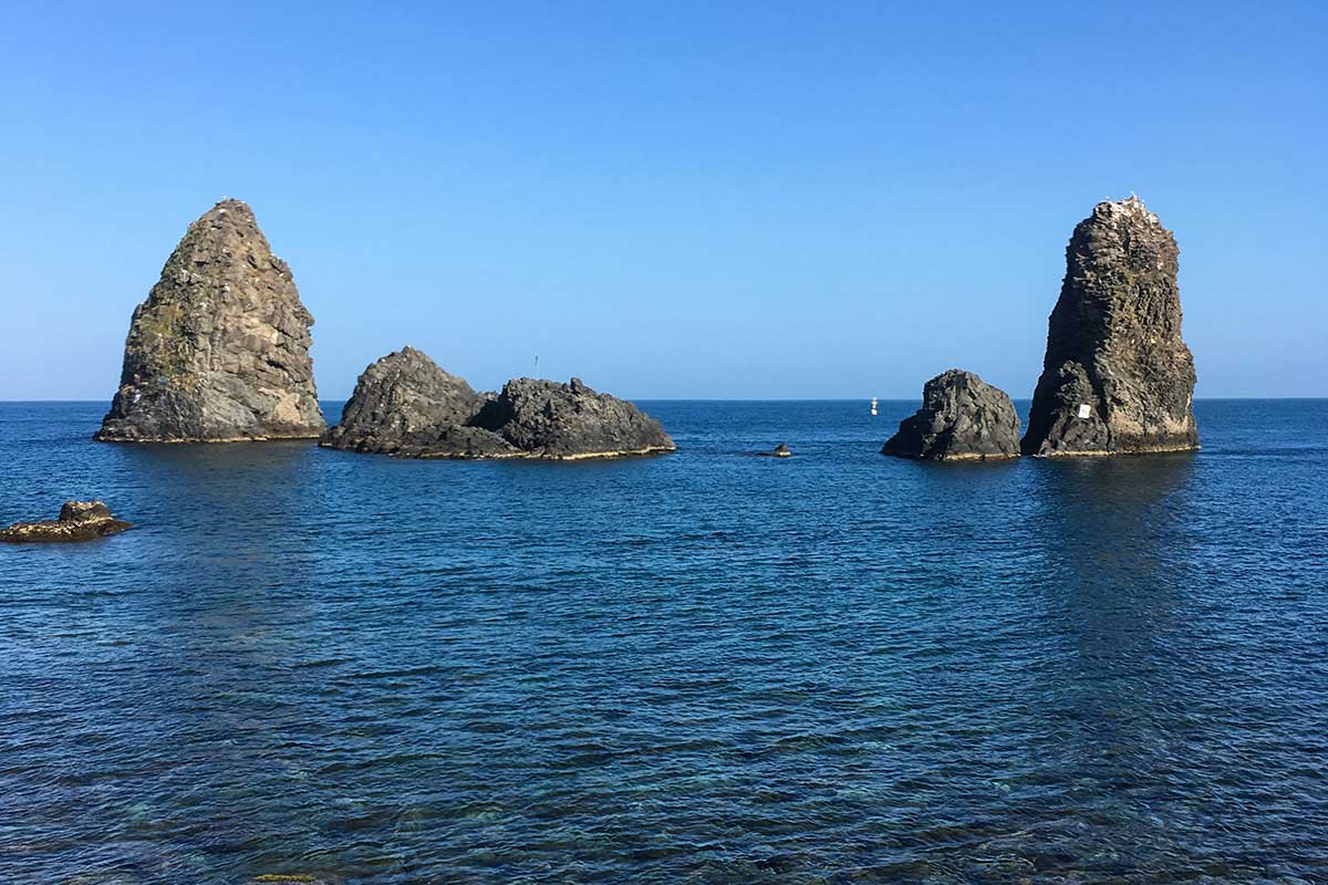 Davanti alla splendida città si stende un litorale di 70 km, la cui varietà è sorprendente. Seguiteci: dalla Serra del Re nei Nebrodi, il Simeto riceve l’acqua del torrente Saracena per poi scorrere per un centinaio di kilometri, e sfociare quindi nello Jonio, dodici chilometri a sud di Catania. Dalla foce al porto di Catania si allunga una striscia sabbiosa di quasi nove kilometri. La foce del Simeto, con i suoi laghetti naturali, le anse e gli acquitrini, è sede protetta di uccelli migratori e stanziali. Il paesaggio è incontaminato, con ampie distese di sabbia dorata, le dune e un mare trasparentissimo. Si tratta dell’ultimo tratto – raggiungibile in auto e poi a piedi – della Playa, il litorale sabbioso sul quale i catanesi amano prendere bagni di mare e di sole. L’arenile, ben servito dai mezzi pubblici, è costellato di impianti turistici e stabilimenti balneari, con spiagge libere e villaggi turistici molto confortevoli. A pochi metri dalla battigia si notano vecchi pescatori immersi in acqua fino al tronco, intenti a scandagliare, utilizzando l’ingegnu (un rastrello a triangolo con una rete), il basso fondale alla ricerca di cozze, meglio, telline: mangiatele crude e assaporerete lo Jonio. Alle spalle una vasta zona di verde, il famoso boschetto della Playa: 338.000 mq. di pini. La spiaggia sabbiosa si conclude allo scalo del porto centrale di Catania: da qui prende il via la scogliera lavica, molto suggestiva, che dal porto alla stazione ferroviaria si chiama Armisi.