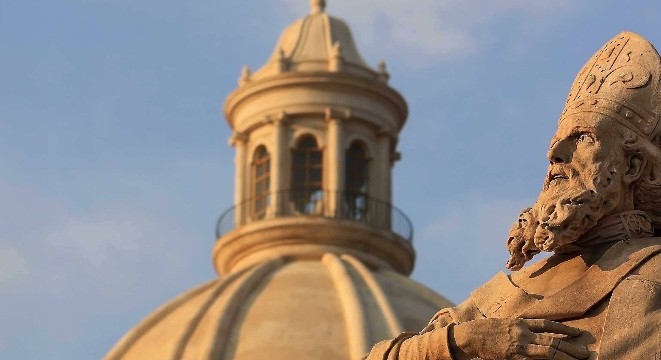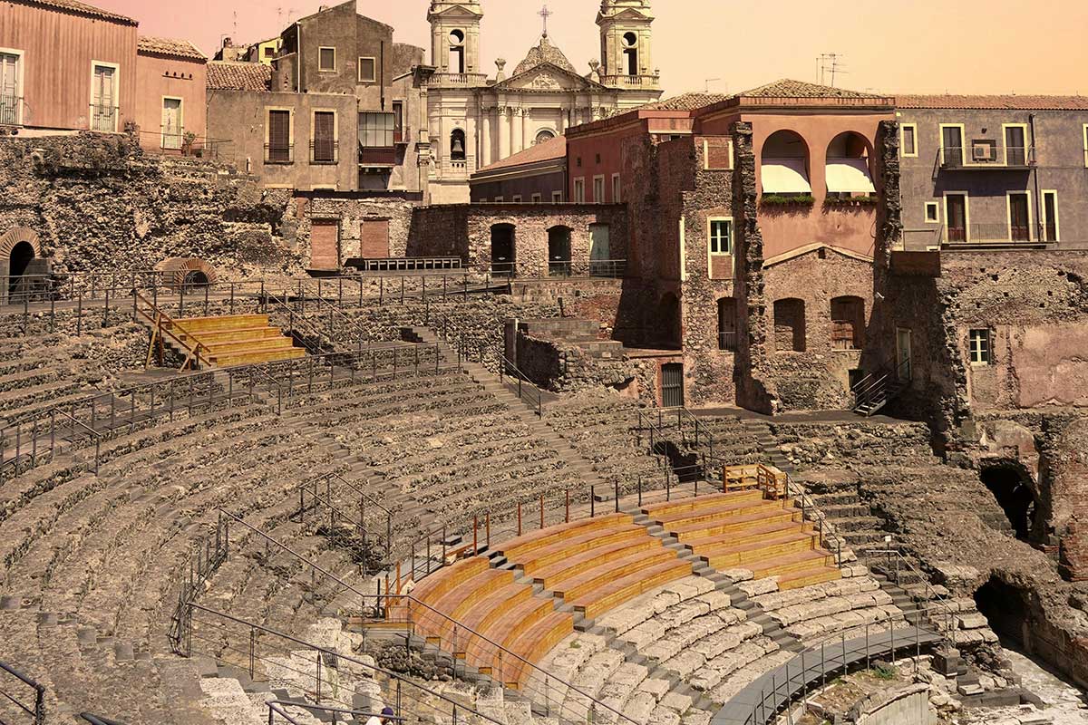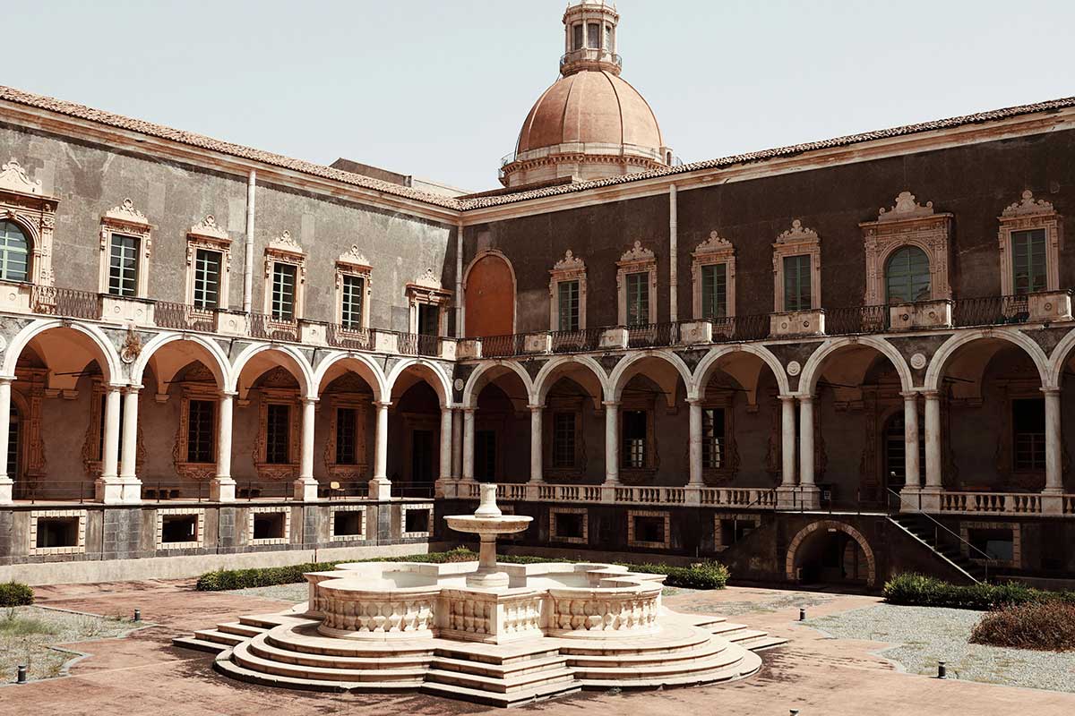 Risalgono all’antica colonia dei greci Calcidesi di Naxos le origini della città di Catania. I Calcidesi si stabilirono alle falde dell’Etna nel 729 a.C., e i primi insediamenti nacquero nel luogo in cui oggi si trova il monastero dei Benedettini. Qui si sviluppò l’acropoli fino al 476 a.C., anno in cui fu conquistata dal tiranno di Siracusa, Gerone, che dopo aver confinato i suoi abitanti a Lentini, impose alla città il nome “Etna”. Ma la reazione dei Calcidesi fu immediata: nel 461 a.C. riconquistarono e riedificarono il luogo al quale restituirono il nome di “Catania o Catina” – il nome, secondo Plutarco, significa “grattugia”, ad indicare la natura lavica del terreno su cui sorge la città. Da questo momento in poi Catania subì altre otto distruzioni, per lo più di origine naturale: eruzioni e terremoti.